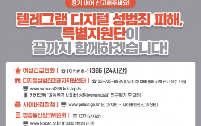 이정옥 여성가족부 장관은 디지털 성범죄 피해자를 보호하고 지원하기 위해 디지털 성범죄 피해자 특별지원단(이하, 특별지원단)을 구성·운영하고 있으며 피해자 지원에 최선을 다하겠다고 1일(수) 밝혔다. 특별지원단은 지난 3월 24일, 민·관이 함께 한 대책회의에서 텔레그