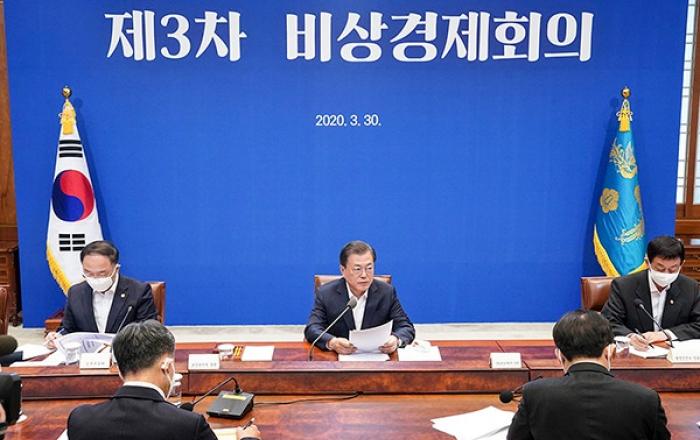 ▲ 문재인 대통령이 30일 청와대에서 코로나19 관련 제3차 비상경제회의를 주재하고 있다.문재인 대통령은 30일 코로나바이러스감염증-19(코로나19) 사태와 관련, “정부는 지자체와 협력해 중산층을 포함한 소득 하위 70% 가구에 대해 4인가구 기준으로 가구당 100만