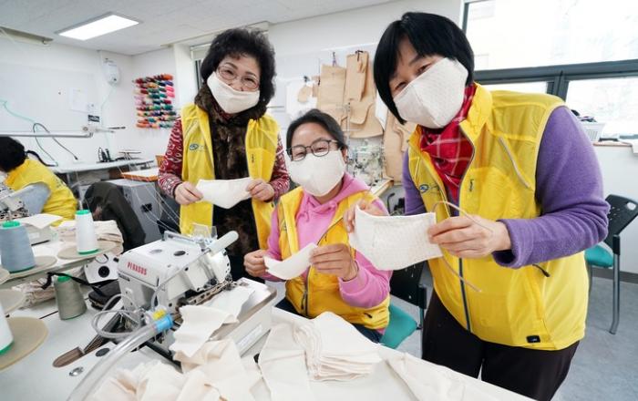 ▲ 동대문구자원봉사센터 소속 자원봉사자들이 재봉틀을 이용해 필터를 교체해서 사용할 수 있는 면 마스크를 만들고 있다.지난주부터 마스크 5부제가 시행되고 있으나 마스크 구매는 여전히 쉽지 않아 주민들이 많은 불편을 겪고 있다.동대문구(구청장 유덕열)가 마스크 한 장을 사
