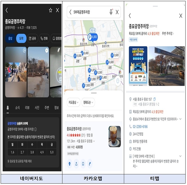 앞으로 공영주차장의 승용차 5부제 시행 여부를 네이버, 카카오, 티맵 등 주요 모바일 지도 애플리케이션(앱)을 통해 간편하게 확인할 수 있게 된다.