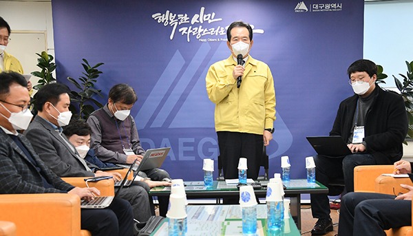 코로나19 사태 수습을 위해 중앙재난안전대책본부 본부장으로 9일째 대구에 머물고 있는 정 총리는 이날 대구시청에서 기자간담회를 열고 “마스크 공적 유통망이 제대로 작동하지 않고 있다면 정부가 더 개입할 수밖에 없다”며 이 같이 말했다.