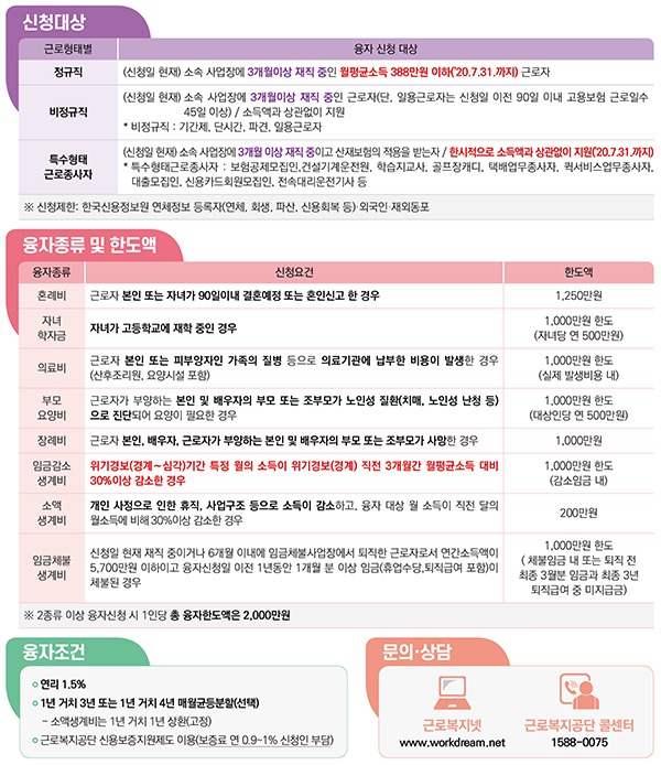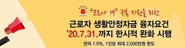 정부는 코로나19 확산으로 어려움을 겪고 있는 노동자의 생계 안정을 위해 생활안정자금 융자 소득요건을 7월 31일까지 한시적으로 완화한다.