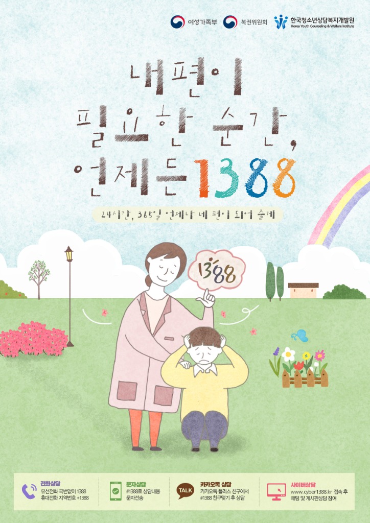 ‘청소년상담 1388’은 365일 24시간 청소년 전문 상담서비스로, 일상적인 고민이나 가출, 폭력 등의 심각한 위기상황까지 언제 어디서나 무료로, 익명으로 편리하게 이용할 수 있다.