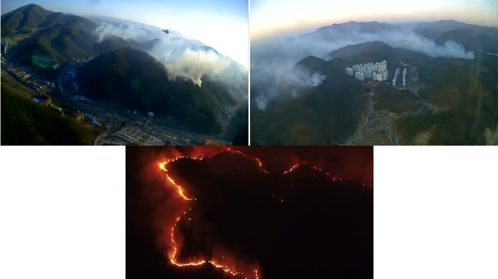 금일 오전 중 진화완료를 위해 중앙산불방지대책본부는 국가기관 산불진화헬기 총동원령*을 내려 5시간여 만에 주불을 진화하고 현재 잔불 진화에 전념하고 있다.