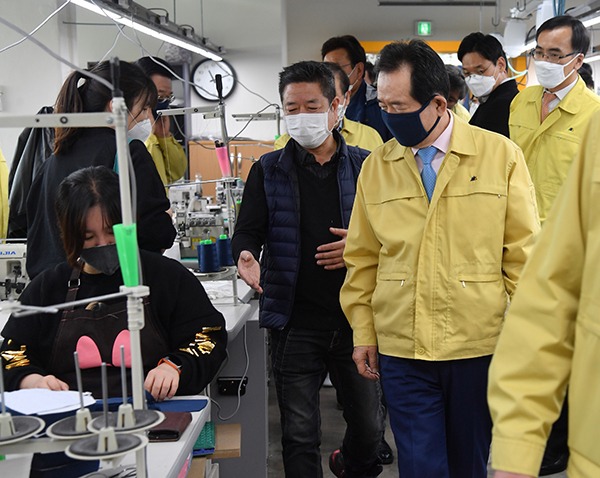 정 총리는 생산현장을 둘러보면서 “면마스크를 빨리 만들어 소상공인들 눈물도 흘리지 않게 하고 취약계층에도 마스크가 많이 보급될 수 있도록 노력해달라”고 당부했다.