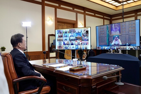 문재인 대통령을 포함한 G20 정상들은 이날 오후 9시부터 개최된 특별화상정상회의에서 ‘코로나19에 관한 공동성명’을 채택했다.