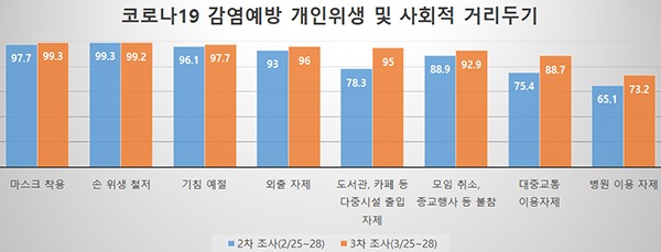 지난달 22일부터 시행 중인 ‘고강도 사회적 거리두기’ 기간 동안 우리 국민의 ‘감염병 예방행동 준수’와 ‘사회적 거리두기’ 실천율이 90% 이상인 것으로 나타났다.