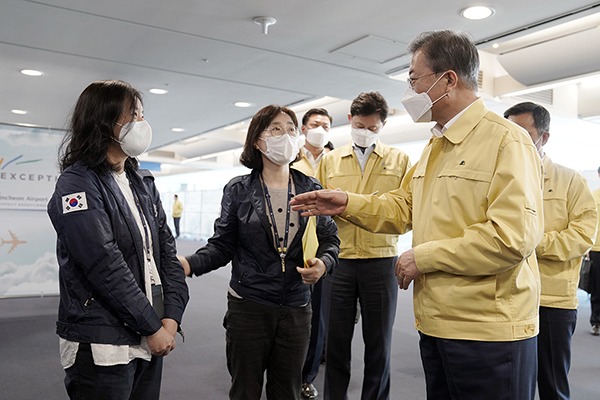 문 대통령은 “인천공항은 우리나라의 검역 및 방역 시스템을 가장 상징적으로 보여주고 있는 곳”이라며 “우리나라가 국경을 전면 봉쇄하지 않고 개방성, 투명성, 민주성 3원칙을 지키면서 방역에 임할 수 있었던 것은 여러분들께서 해외 유입을 철저히 통제할 수 있다는 자신감이 있었기 때문”이라고 말했다.