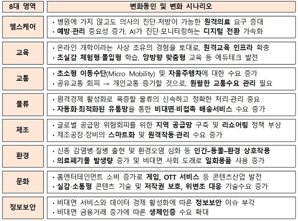 전문가 인터뷰 등을 통해 8개 영역별 구체적인 변화상과 시나리오를 예측한 결과, 건강관리와 원격의료 중심의 의료시스템 변화, 다양한 비대면·원격 서비스의 편리성·효과성·보안성 향상, 교통·물류·제조 등 산업영역의 자동화·지능화 등이 주요 이슈로 대두되고 있다.