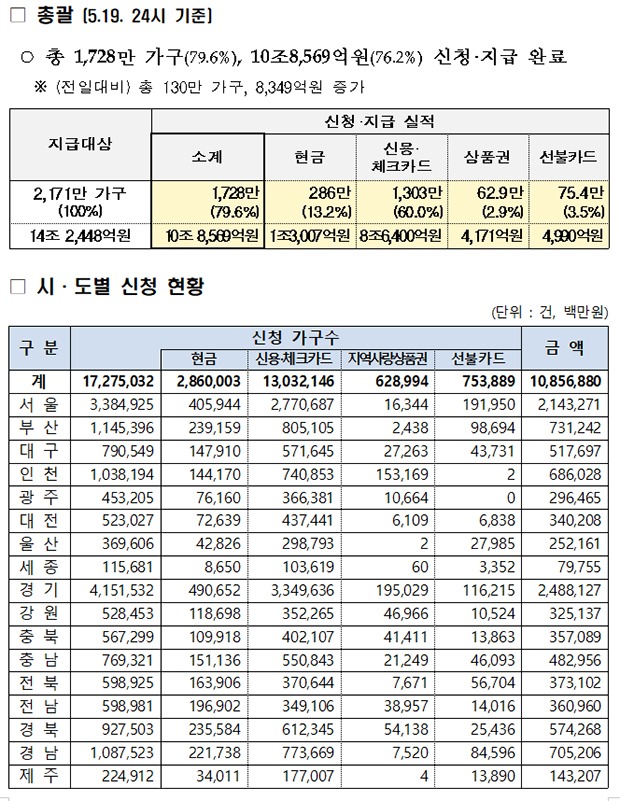 행정안전부는 19일까지 신청·지급이 완료된 긴급재난지원금 액수가 총 10조 8569억원(76.2%), 수령 가구는 1728만 가구(79.6%)로 집계됐다고 20일 밝혔다.