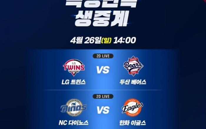 CJ CGV가 오는 26일 오후 2시에 열리는 KBO 리그 주요 경기 두 건을 극장에서 실시간 생중계한다.이번 생중계 대상은 서울 잠실야구장에서 진행되는 'LG 트윈스 vs 두산 베어스' 경기와 대전 한화생명 볼파크에서 열리는 'NC 다이노스 vs 한화 이글스' 경기다