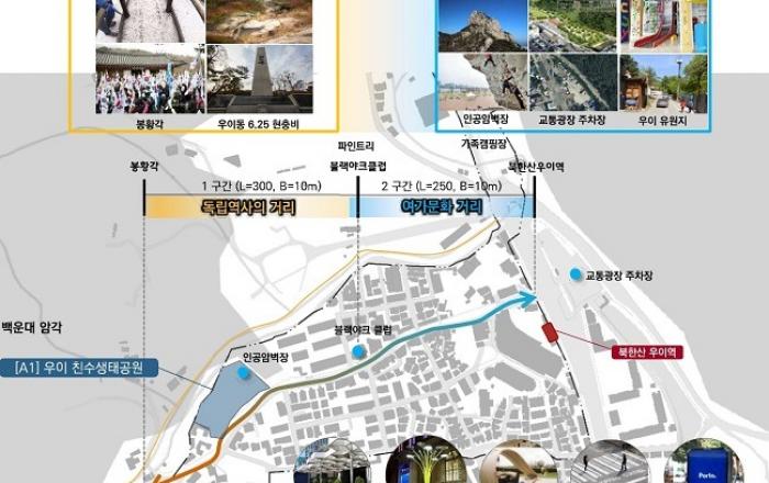 서울시가 북한산우이역에서 내려서 북한산으로 가는 진입로인 강북구 삼양로173길 일대(북한산우이역~봉황각) 550m 구간을 북한산의 자연환경과 독립역사가 살아있는 ‘특화거리’로 재생한다.북한산을 찾는 등산객들이 많이 이용하고 있지만 낙후해 상권이 쇠퇴하고 특색이 없어 그