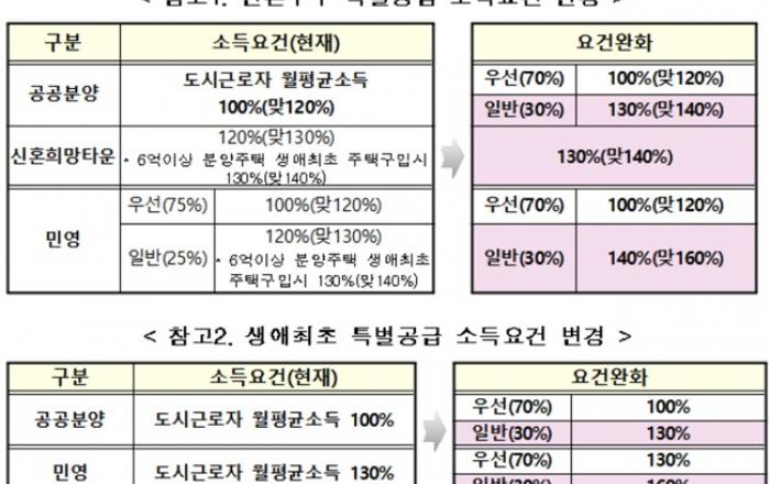 다음달 2일부터는 민영주택 신혼부부 특별공급에 월 888만원(연봉 1억 656만원)을 받고 자녀가 한 명 있는 맞벌이 부부에게도 청약 기회가 제공된다.신혼희망타운 분양 소득요건도 월평균 소득 120%(맞벌이 130%)에서 130%(맞벌이 140%)로 10%포인트 올라간