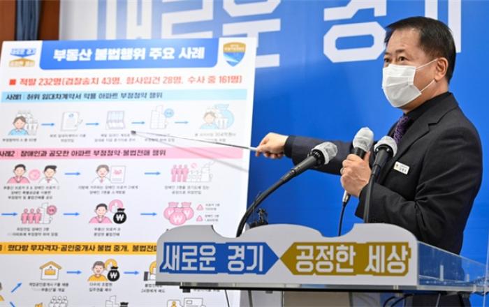 경기도 특사경이 부동산 불법행위로 얻어지는 불로소득 근절과 무주택 서민 보호를 위한 대대적인 수사 활동에 들어간다.중점 수사대상은 ▲아파트 부정청약 및 불법전매 ▲집값담합 등 부동산 거래질서 교란행위 ▲무자격․무등록 중개행위 ▲토지거래허가구역 내 부정행위 등이다.분야별