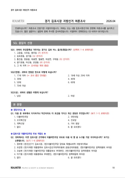 4인 후보자 적합도 여론조사(해상도 수정분) 김용식 기자 발행 2026-04-13 05:51 Facebook Twitter band 네이버블로그 카카오스토리 카카오톡 글자작게 글자크게 기사내용 무 ▲ 후보적합도 여론조사▲ 후보적합도 설문지 <저작권자 ⓒ 울림뉴스, 무단 전재 및 재배포 금지> 김용식 기자 다른기사보기