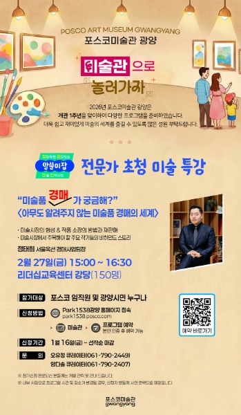 광양제철소 관계자는 “포스코미술관 광양 1주년을 앞두고 직원들과 시민들을 위한 미술 전문가 특강 프로그램을 기획하게 됐다”며 “앞으로도 시민들이 궁금해하는 미술의 세계를 더욱 쉽고 재미있게 접할 수 있도록 다채로운 기회를 계속 마련할 것”이라고 밝혔다.
