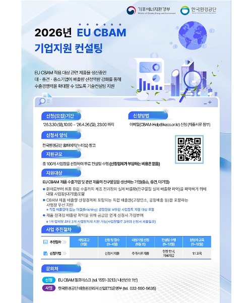 기후부는 내달 26일까지 '2026년 유럽연합 탄소국경조정제도 대응 기업 상담지원' 참여 기업을 모집한다. 이번 사업은 전문가가 직접 기업 현장을 방문해 탄소 배출량 산정부터 검증까지 제도 대응에 필요한 핵심 절차를 맞춤형으로 지원하는 것이 골자다.