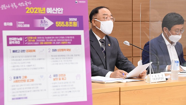 홍남기 부총리 겸 기획재정부 장관은 “내년 예산안은 경제회복에 대한 정부의 의지를 담아 감내 가능한 범위 내에서 최대한 확장적 기조로 편성했다”고 기본 방향을 밝혔다.