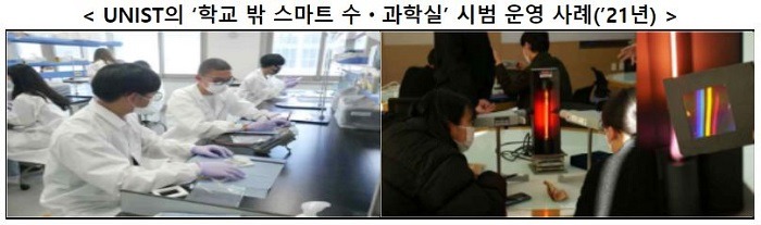 한편, ’21년 울산과학기술원(UNIST)을 통해 「학교 밖 스마트 수ㆍ과학실」을 시범 운영한 결과, 참여한 학생 등의 만족도가 매우 높게 관찰되는 등 (만족도 조사 95점 상회(100점 만점)) 추진 효과가 높은 것으로 확인되었다.