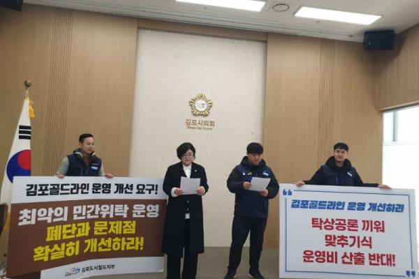 밀실행정 근절과 근로의 권리를 주장더불어민주당의 김계순 의원과 김포도시철도지부 지부장 박찬연(민주노총 공공운수노조, 이하 박찬연 지부장이라고 칭함)이 김포도시철도의 문제점에 대해 공동으로 2026.02.26. 오전 09:30에 김포시 의회 브리핑룸에서 기자회견을 했다. 김계순 의원은 김포시, 김포골드라인 부실운영 확인과 ...