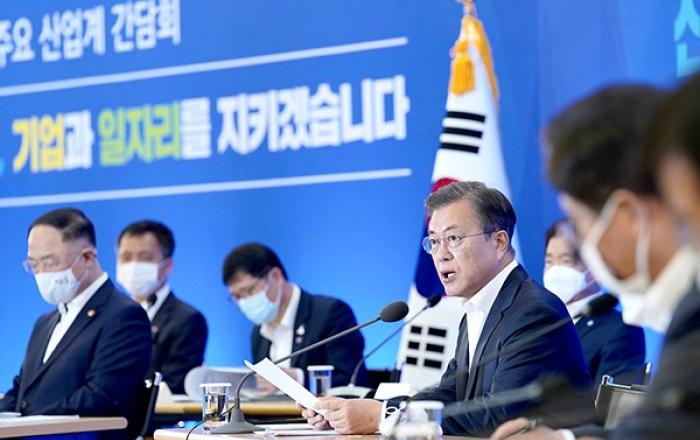 문재인 대통령은 21일 “기업과 정부, 국민이 모두 합심하면 코로나로 유발된 산업 위기를 극복하고, 디지털 경제 시대의 강자로 거듭날 것이라 확신한다”고 말했다.▲ 문재인 대통령이 21일 서울 강남구 삼성동 무역협회 대회의실에서 열린 ‘위기 극복을 위한 주요 산업계 간