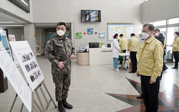 강민석 청와대 대변인은 서면 브리핑을 통해 “이날 국군대전병원 방문은 문 대통령이 지난달 25일 대구 방문 시 ‘국가 가용자원을 총동원해 대구·경북 지역을 지원하라’고 지시한 이후의 상황을 점검하고, 군 의료진을 격려하기 위한 것”이라고 전했다.