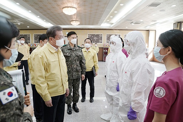 문재인 대통령은 2일 대구·경북 지역의 코로나19 환자 치료 지원을 위해 국가 감염병 전담병원으로 전환해 운영 중인 국군대전병원을 방문했다.